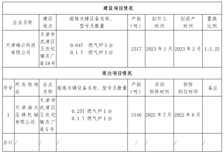 按照《工业和信息化部办公厅发展改革委办公厅生态环境部办公厅关于重点区域严禁新增铸造产能的通知》(工信厅联装〔2019〕44号)和《天津市铸造行业产能置换实施办法》文件要求,对天津峰云科技有限公司建设项目铸造产能置换方案进行了公示,公示期间无异议现予以公告。监督电话83605948。